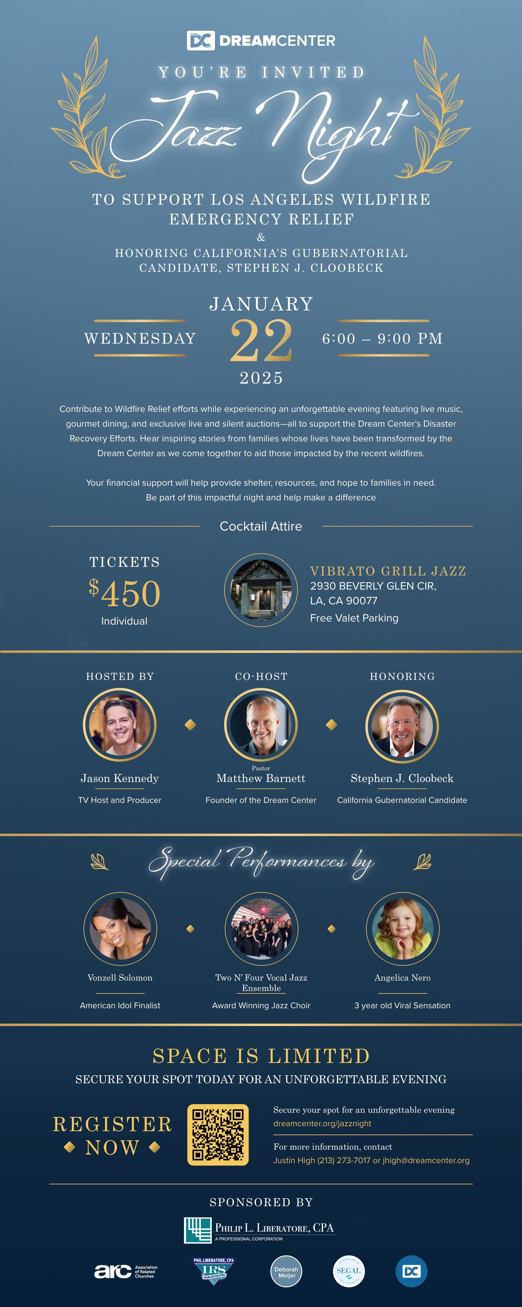 Dream Center Jazz Night—Supporting LA Wildfire Emergency Relief Wednesday, January 22, 2025 1:00 PM 2:00 PM Vibrato Grill Jazz 2930 Beverly Glen Circle Los Angeles, CA, 90077 United States (map) Google Calendar ICS Purchase through dream center